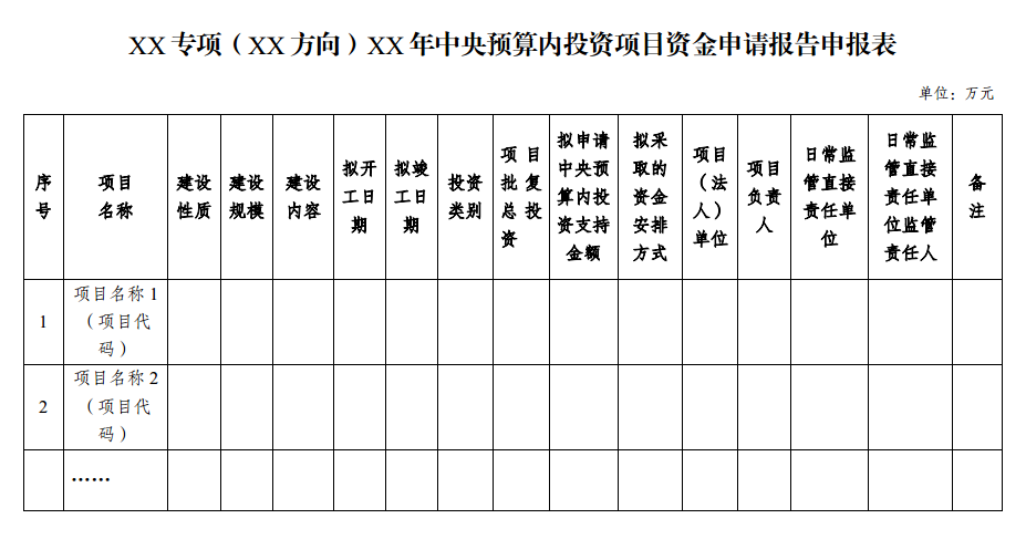 九、對以打捆、切塊方式安排中央預(yù)算內(nèi)投資的專項,各省級發(fā)展改革委和有關(guān)中央單位可匯總編制資金申請報告。其中,以打捆方式安排的專項,具體項目材料應(yīng)按照上述格式編制,并作為附件一并報送;以切塊方式安排的專項,可以不報送具體項目材料。